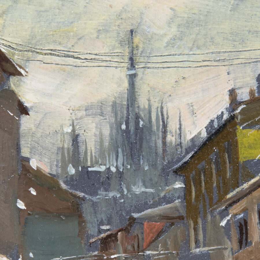 Painting on panel depicting Brumist at the station Milan in the rain with the Duomo in the background.