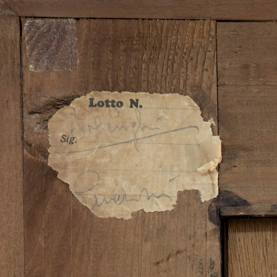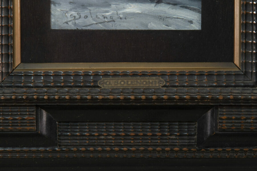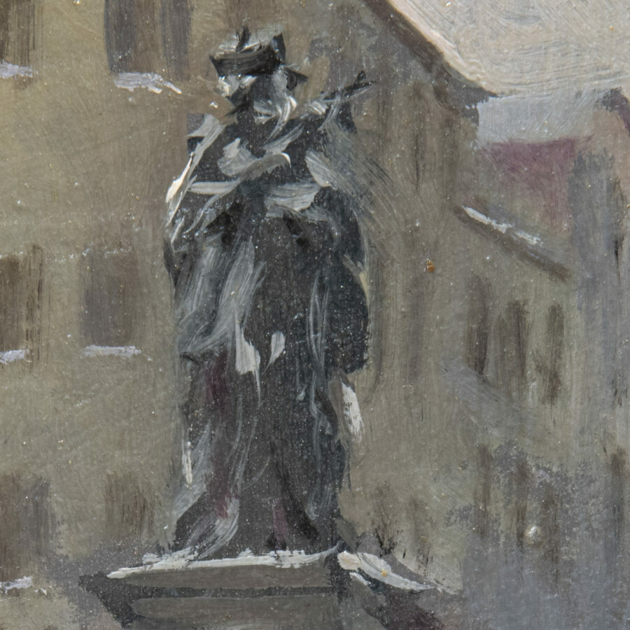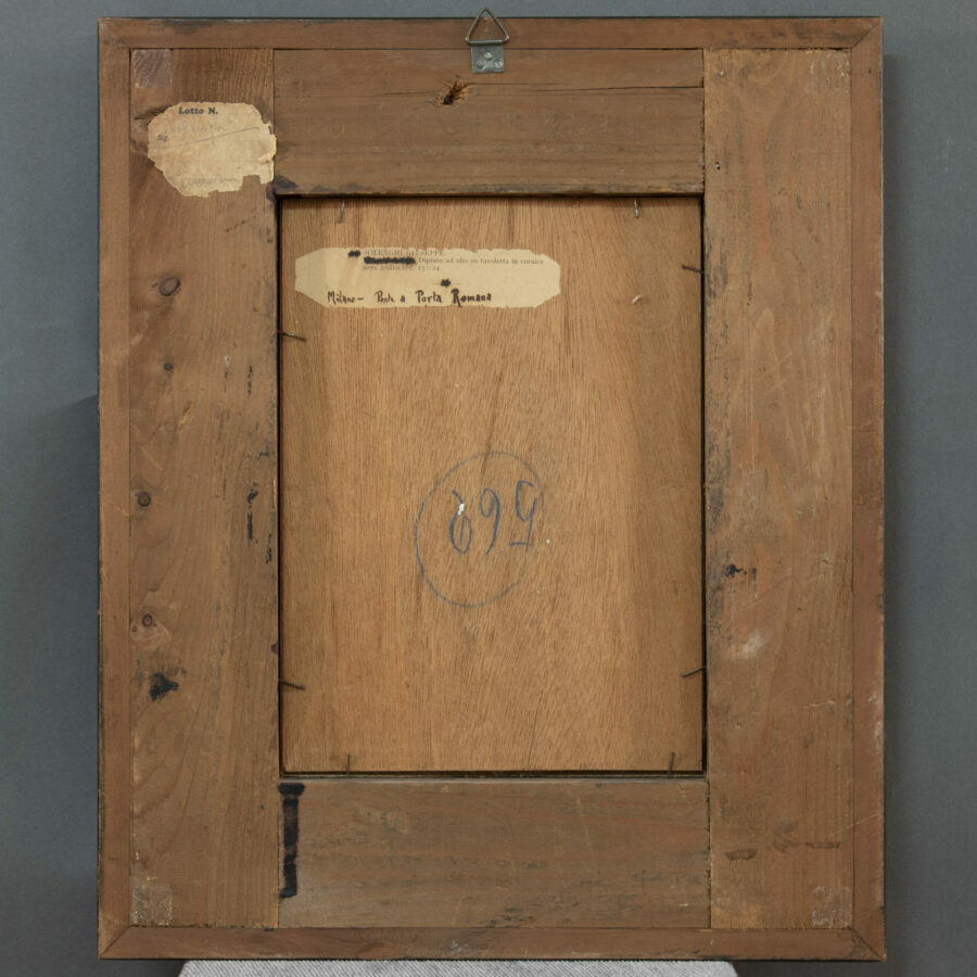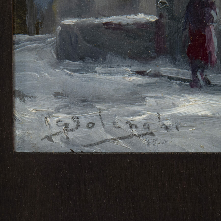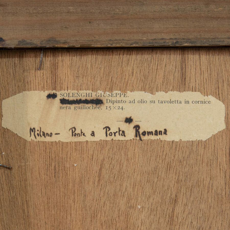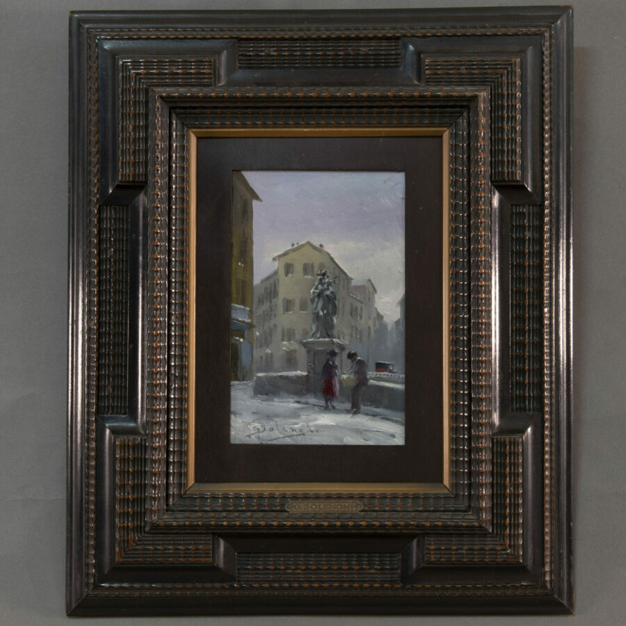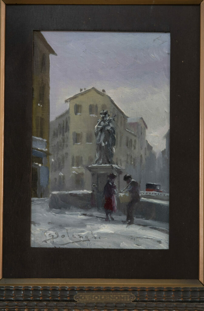 Painting on panel depicting Bridge of Porta Romana Milan in the snow signed by Giuseppe Solenghi (Milan 1878 – Cernobbio 1944).