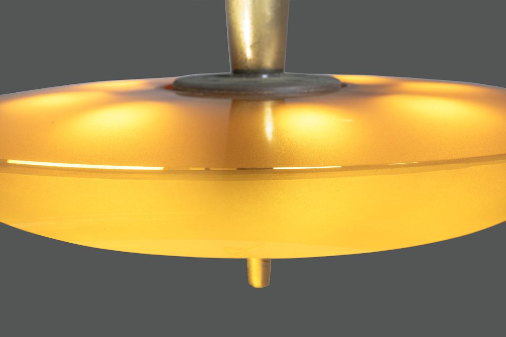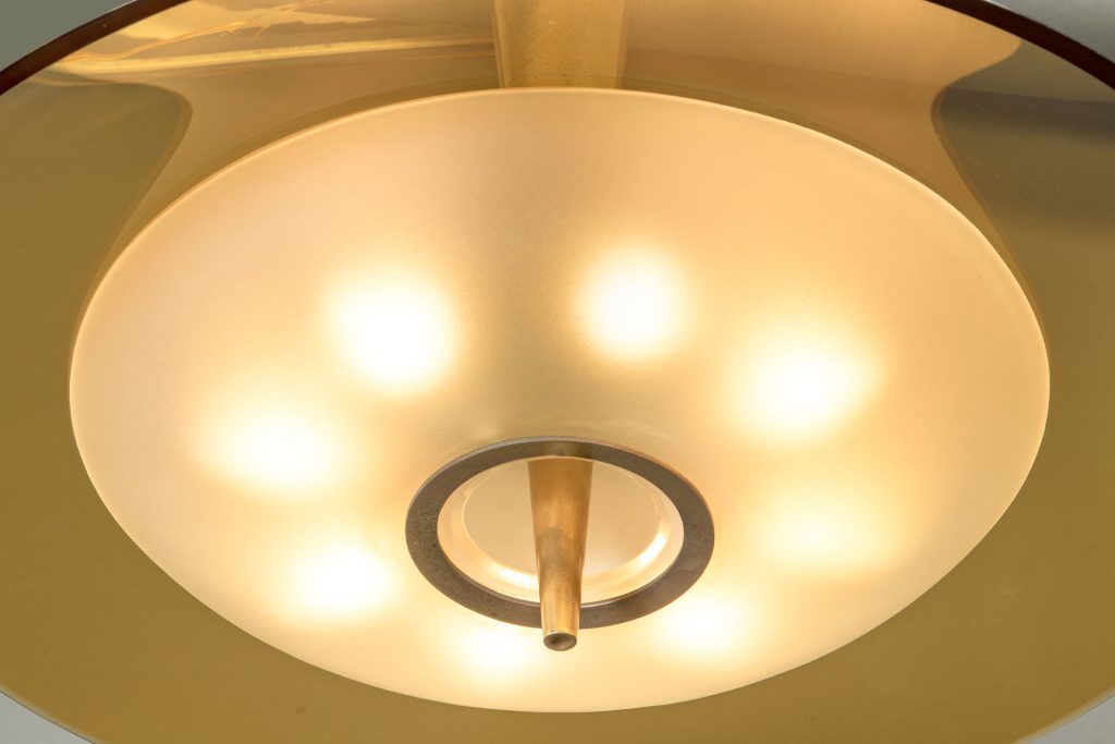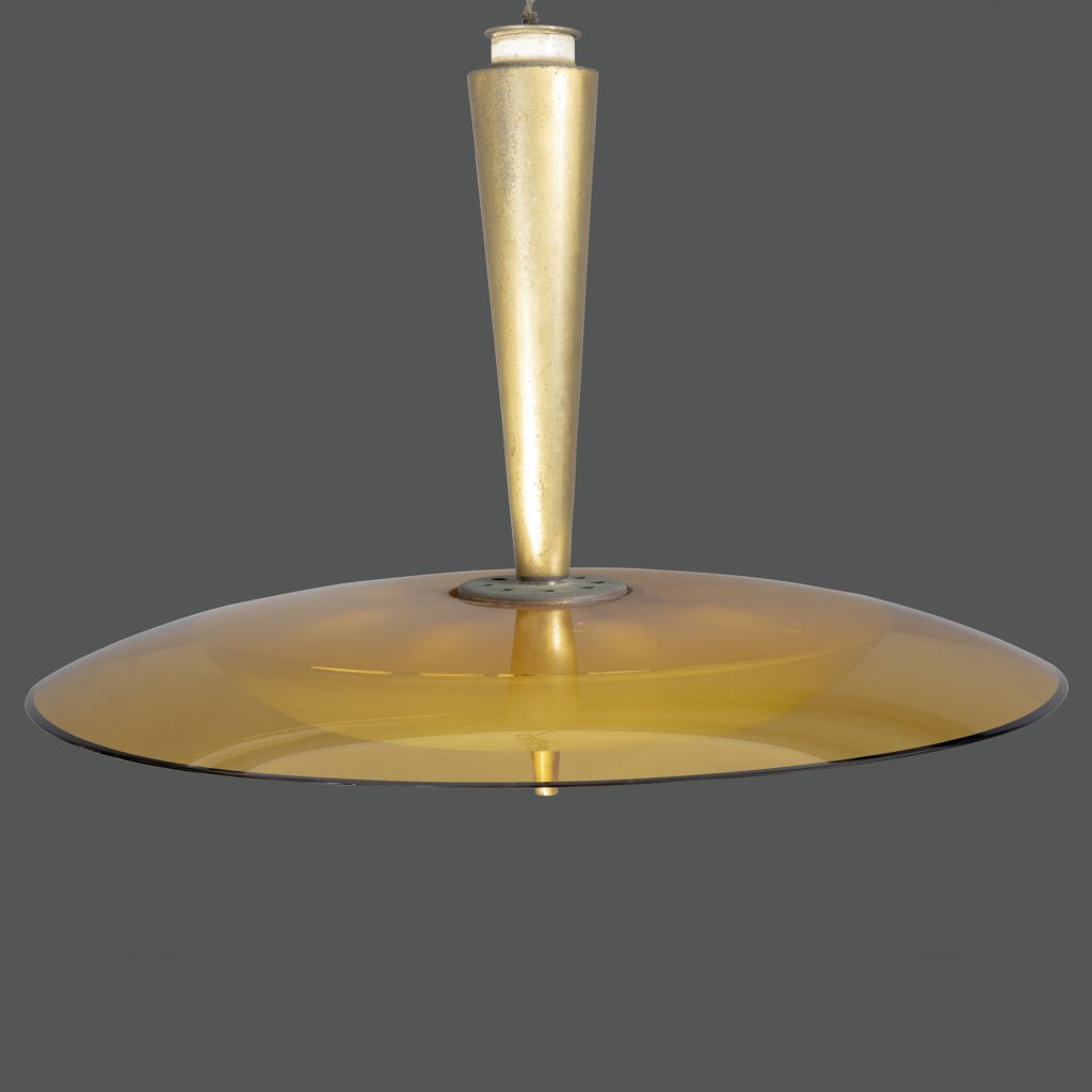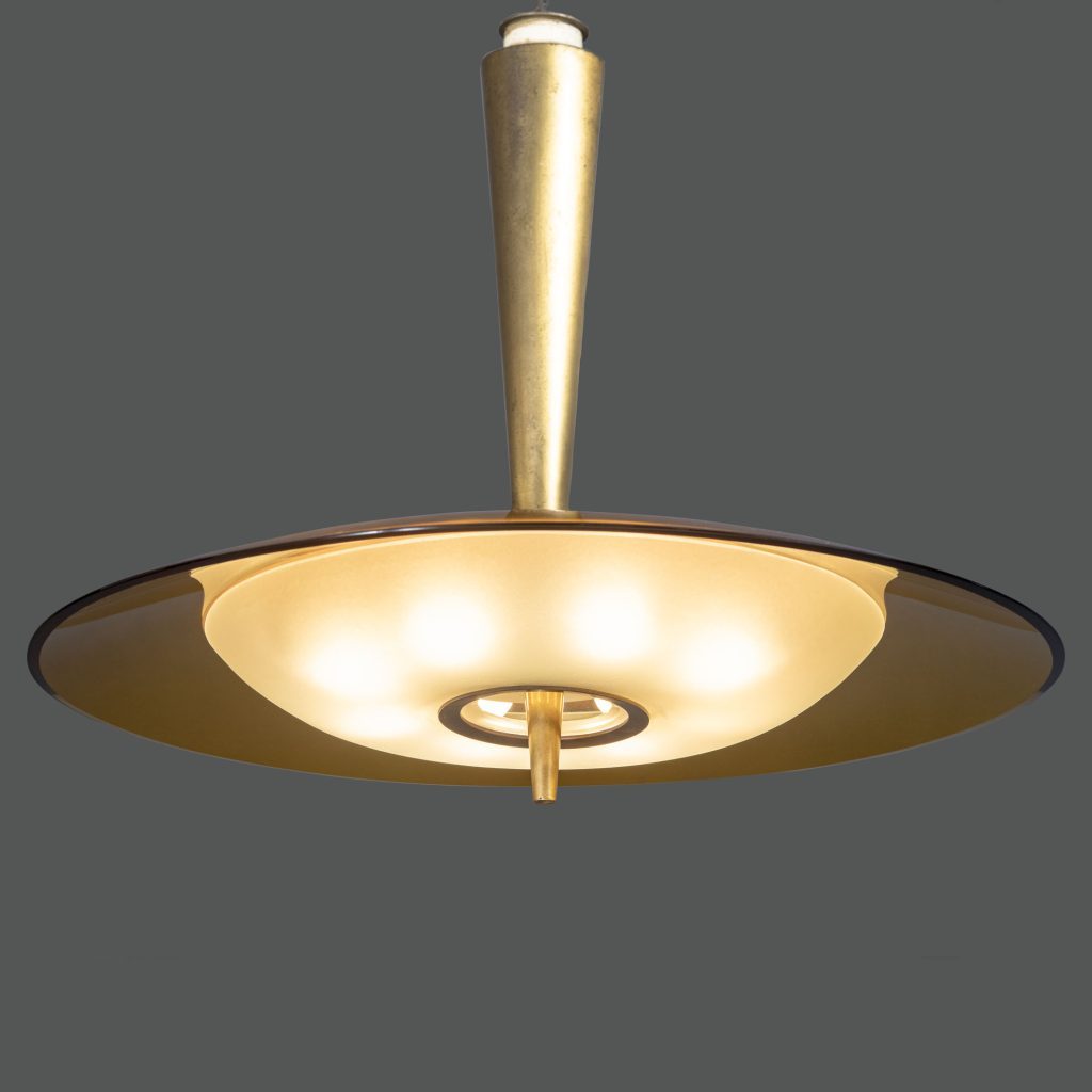 The hanging lamp is supported by a conical-shaped stem in gilded brass with a satellite shape that renders it a key element as a prestigious and exclusive furnishing piece.