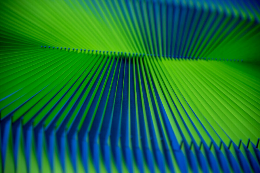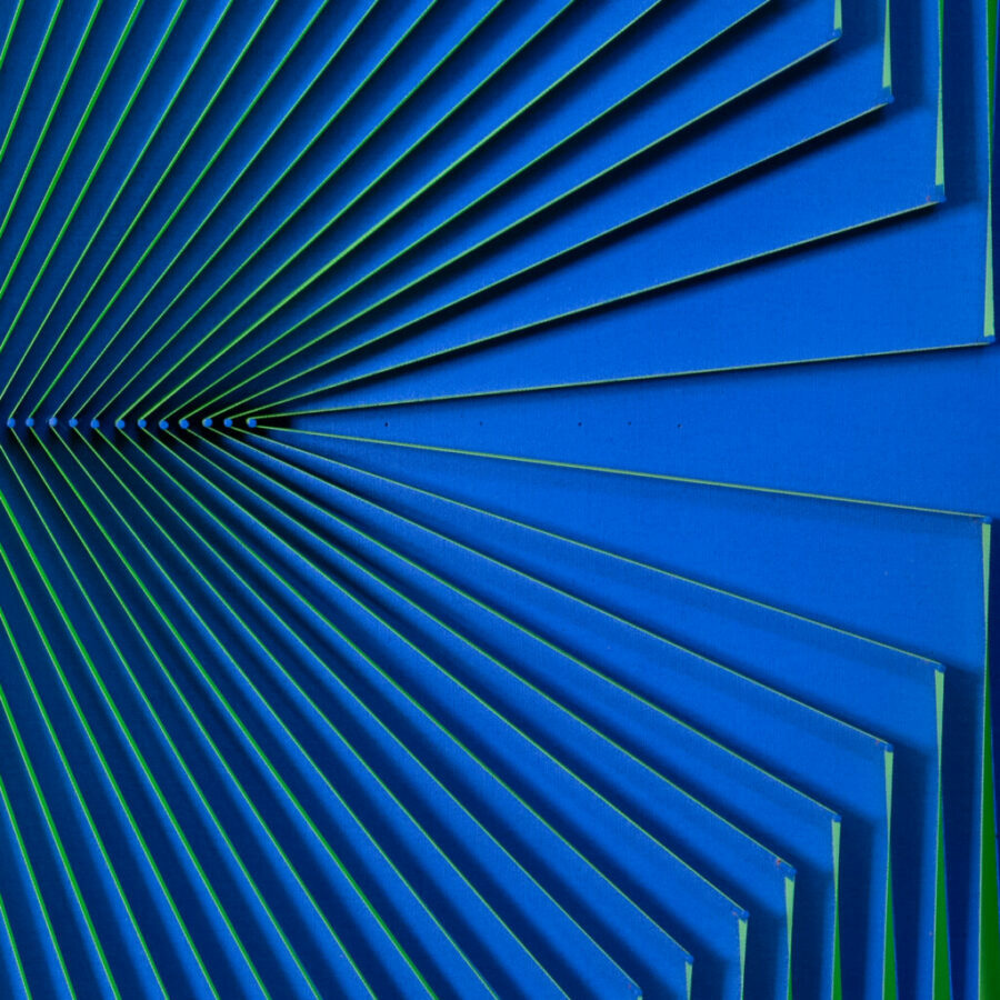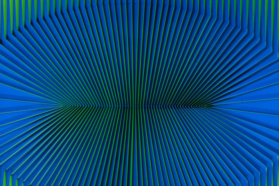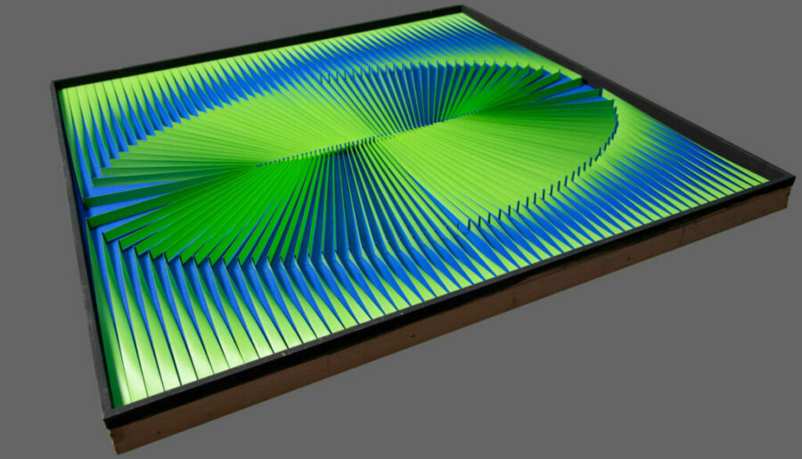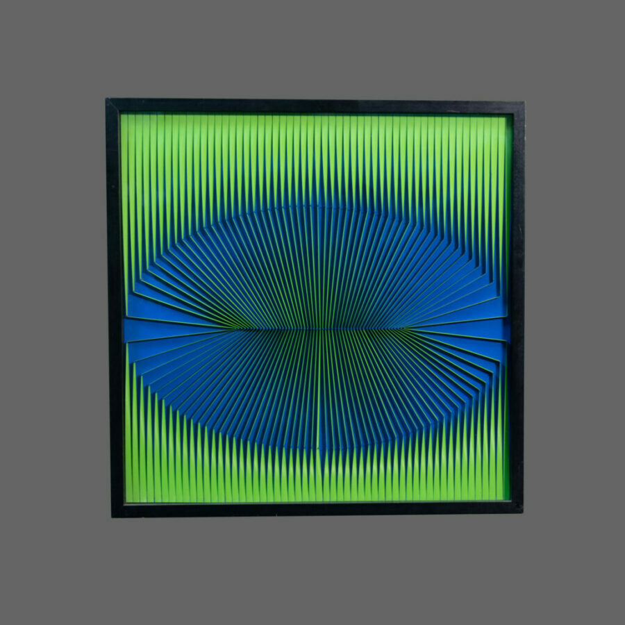 Alberto Biasi Politipo 1973 fines bandes PVC au premier plan sur fond en bois.