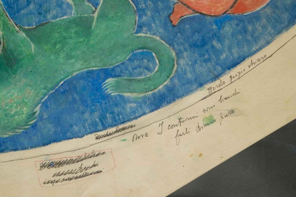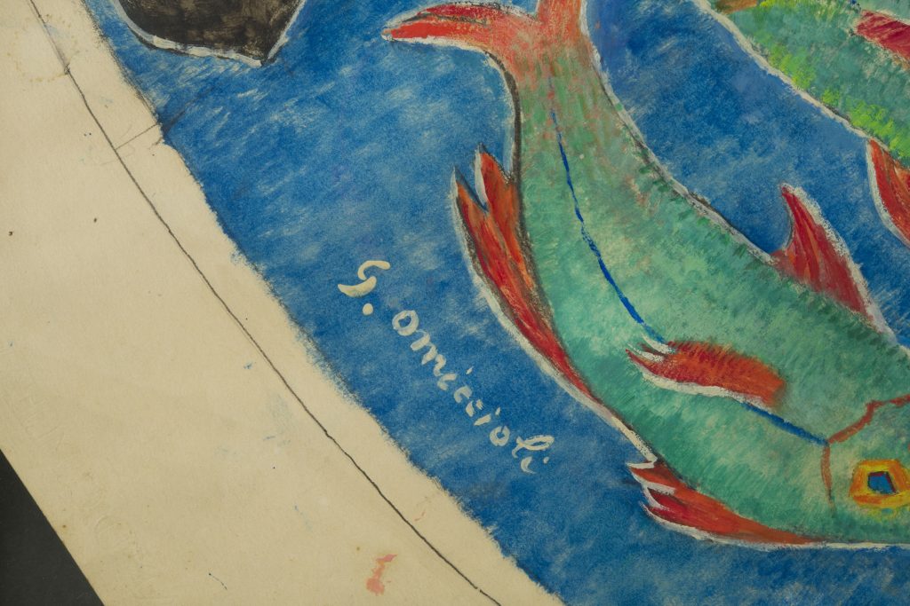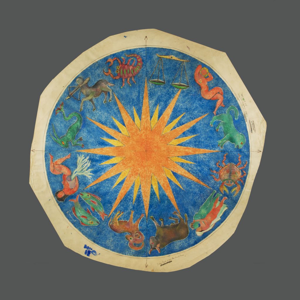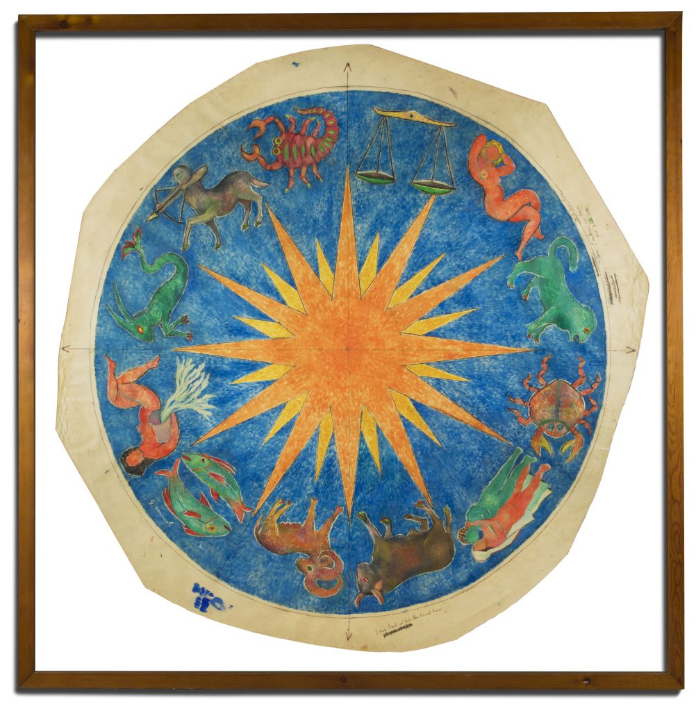Giovanni Omiccioli (1901-1975) pittore romano appartenente al gruppo dei pittori della Scuola Romana, intorno agli anni Quaranta del Novecento ha realizzato Lo zodiaco, grande opera unica su carta a taglio ottagonale, firmata in basso a sinistra G. Omiccioli. Nella parte centrale del dipinto, che riflette l’interesse di Omiccioli per l’astrologia e la simbologia, sono rappresentati, su sfondo blu, tutti i segni zodiacali e al centro una stella o rosa dei venti. Sul bordo dell’opera, sono visibili gli appunti del Maestro Omiccioli sulla sequenza dei colori per le maestranze che avrebbero realizzato il lavoro. L’opera è protetta da vetro sia sul fronte che sul retro e da una cornice lineare in legno. Misura 175 x175. La Fondazione Omiccioli Archivio e Autentiche ha archiviato l’opera.