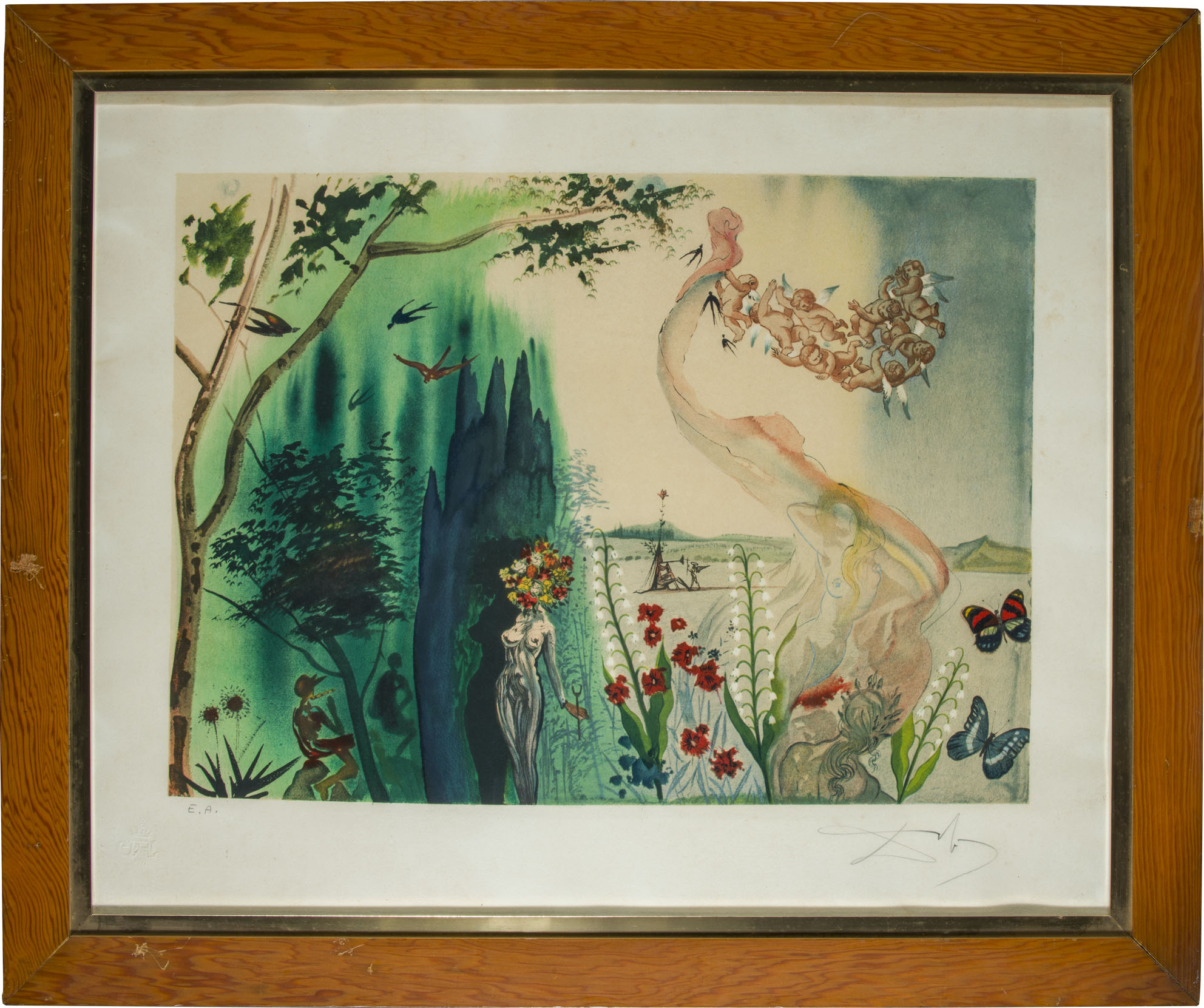 Salvador Dalí “Primavera” Litografia a colori appartenente al ciclo Le Quattro Stagioni una delle serie grafiche più affascinanti realizzate dal maestro del Surrealismo. Questo esemplare Épreuve d’Artiste (E.A.), firmato a mano da Salvador Dalí e con timbro a secco dell’editore, rappresenta una rara opportunità per collezionisti e appassionati della grafica originale del Novecento.