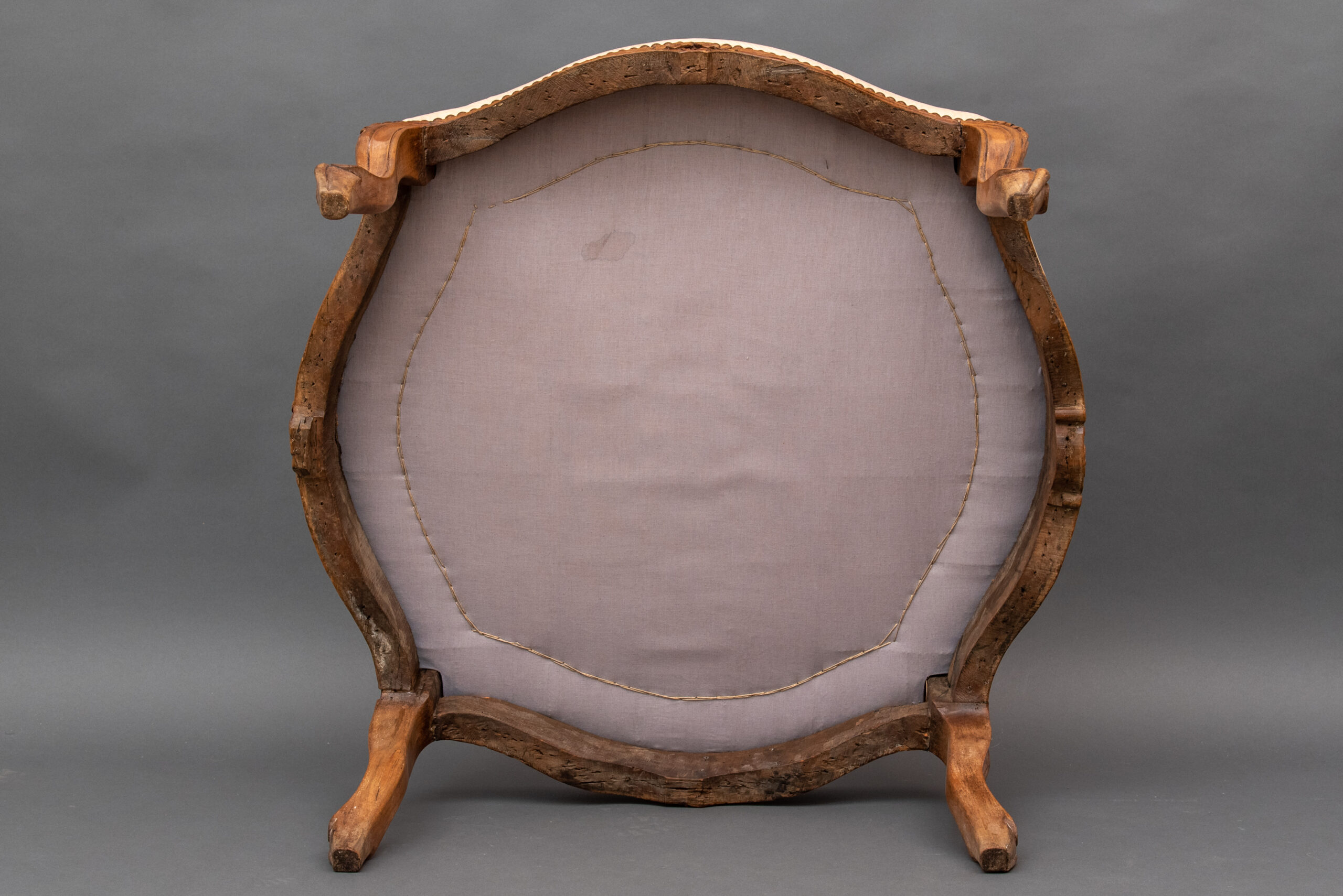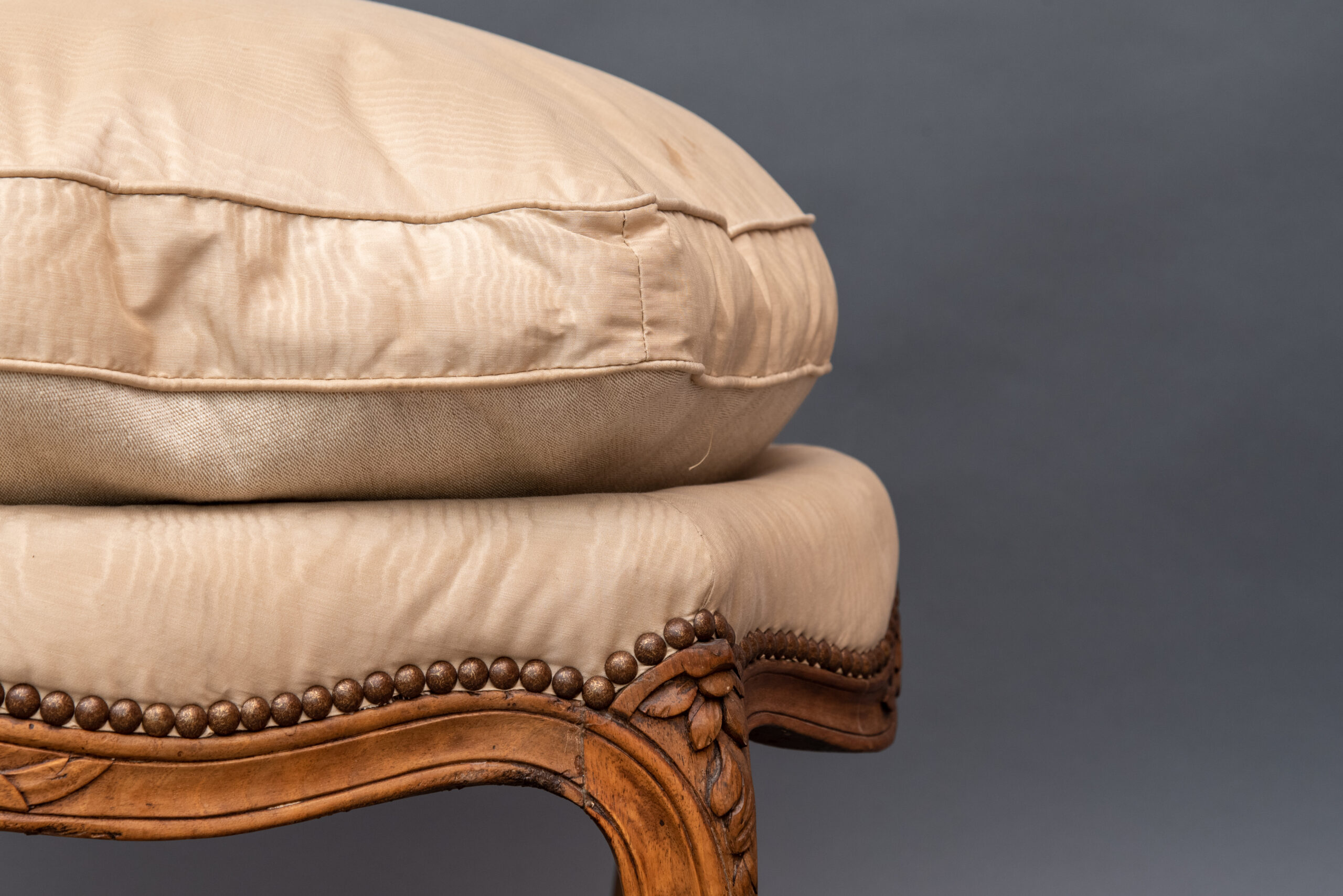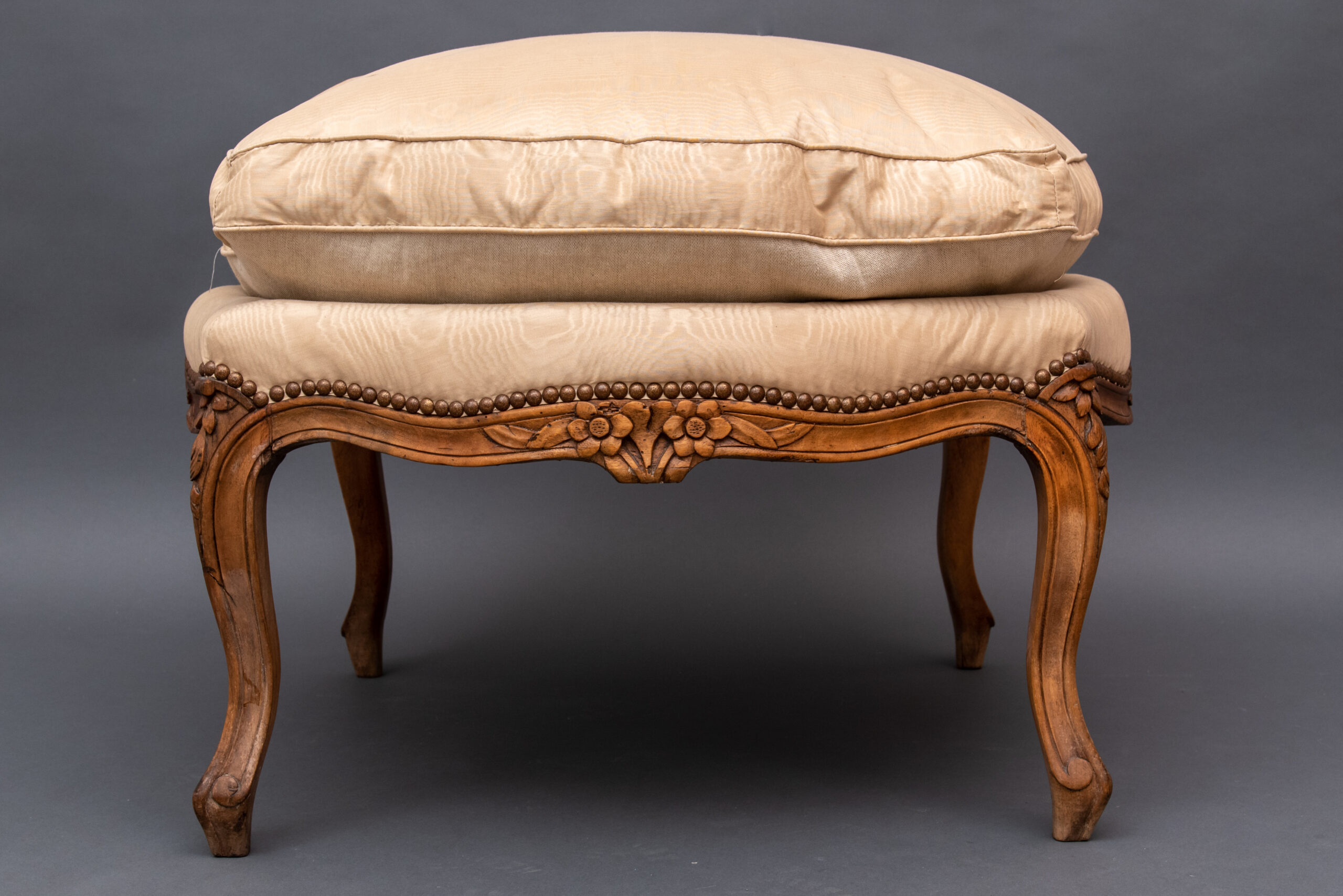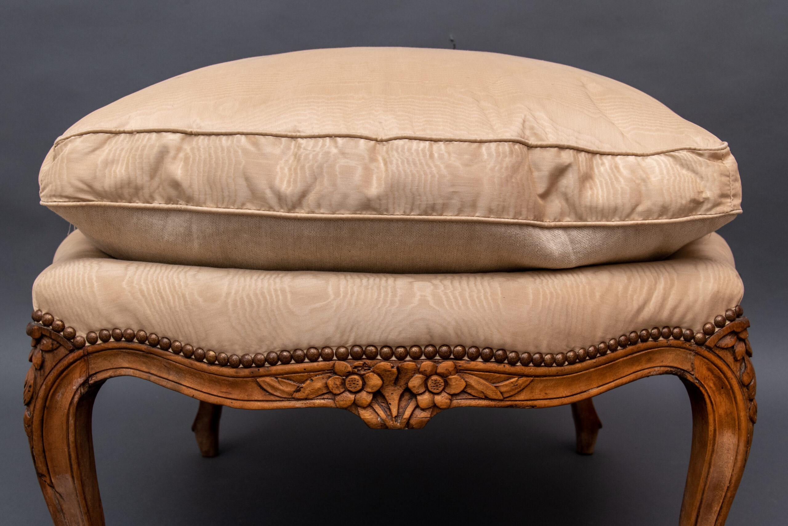 Sgabello con delicati dettagli intagliati a mano e gambe curve à cabriolet in stile Luigi XV. Cuscino imbottito in Moiré originale. Macchie sul cuscino.