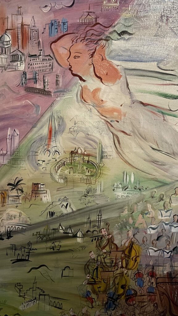 Modernità e classicismo si mescolano in quest’opera colossale, definita il dipinto più grande del mondo, in cui Dufy dimostra il suo raffinato eclettismo di cacciatore di immagini. Agli occhi di tutti, egli incarna l’unione utopica tra arte e industria, tra decorazione e design teorizzata nel dopoguerra.